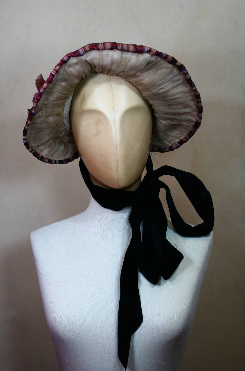 Capote in taffetas cangiante rigato a fondo viola (ordito nero e orditi a disposizione, trama rosa ciclamino) con coppie di righe sfumate in bianco-nocciola e celeste-blu. Calotta morbida, formata da una fascia e cima circolare, entrambe arricciate da impunture a filza. L'ampia tesa sagomata è irrigidita da supporto interno e ferretto lungo il bordo. Sul lato destro è applicato un grande fiore con petali in taffetas sfumati rosa e viola.\nSulla nuca sono fermati grossolanamente due lunghi nastri di velluto nero (sostituiti?) da annodare per fissare il cappello sotto il mento. Fodera della calotta in rada tela bianca, sottotesa in taffetas rosa antico ricoperto da crespo avorio arricciato. La confezione del cappello non è particolarmente accurata.