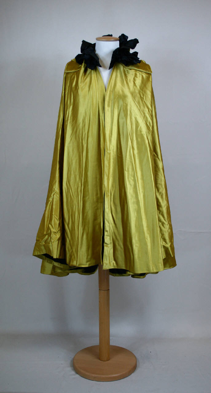 Mantello a mezza ruota, lungo sotto il ginocchio, in raso giallo oro, garzato all'interno. Alto collo formato da doppia ruche in nastro di raso nero, decorato sul dietro da grossa treccia resa da tubolare di raso giallo (cordoncino all'interno), fermata da due grandi bottoni rivestiti in raso giallo. Spalle modellate da piccolo sprone separato, decorato con il tubolare giallo che forma trifoglio verso il dietro.\nNon presenta sistema di chiusura ed è foderato in raso nero.