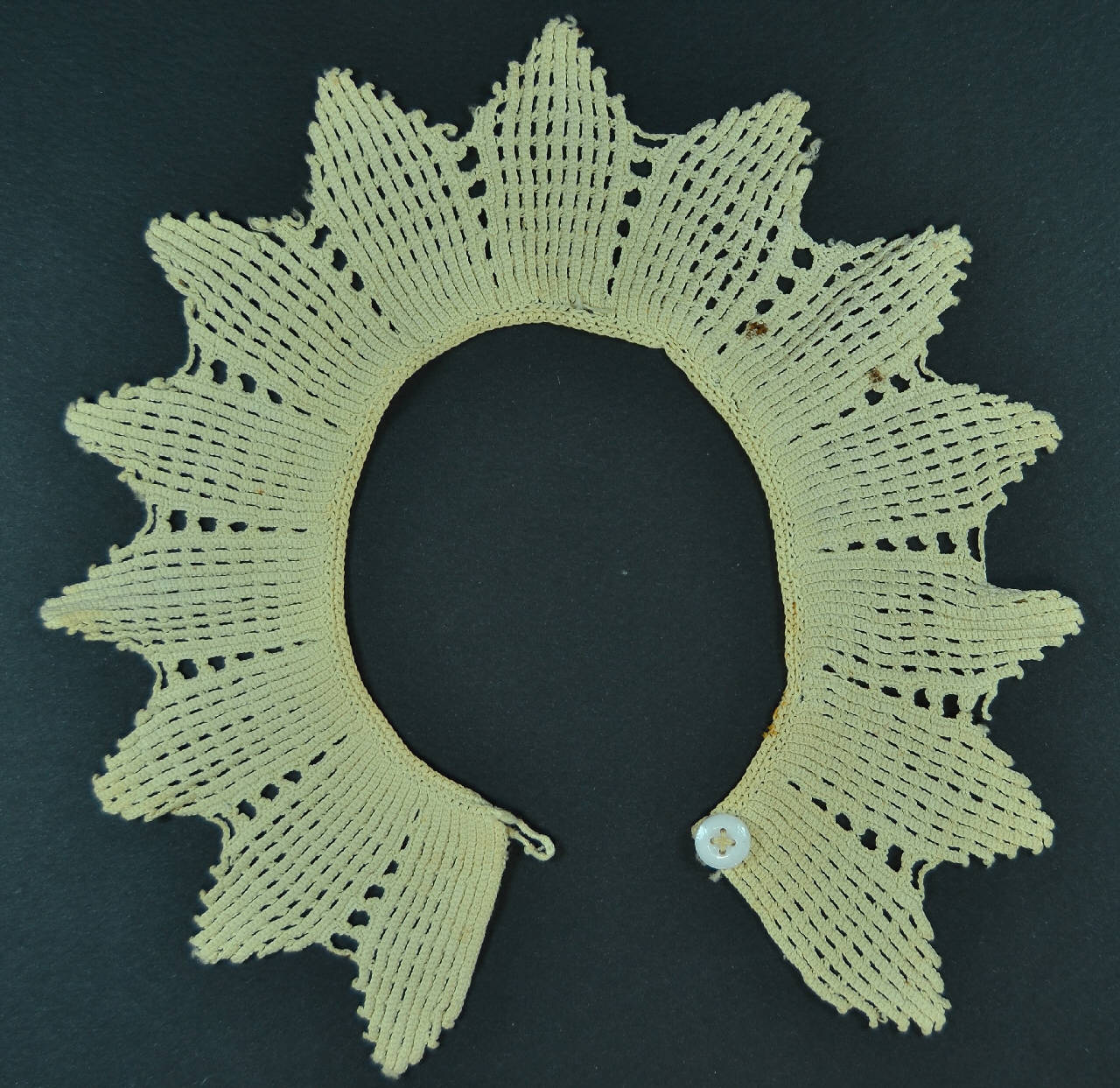 Piccolo collo piatto eseguito ad uncinetto con filo avorio. La lavorazione, a p. catenella e maglia bassa, forma 14 punte realizzate in modo da allargarsi verso l'esterno. Chiuso allo scollo da bottoncino in madreperla e asola ad ago.