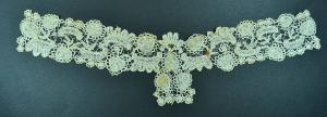 Collo avorio a fascetta, in merletto a fuselli, a p. tela e treccine con picot. Coppie alternate con orientamento capovolto, formate da una foglia e una voluta con piccole creste o fiorellini. Al centro davanti pende un elemento quadrato formato dalle foglie e fiorellini.