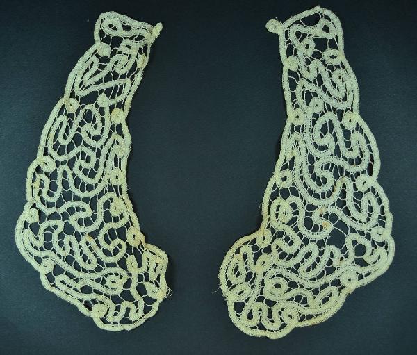 Collo piatto in due pezzi, in lino avorio. Fettuccia continua meccanica che forma motivo labirintico, collegata da barrette ad ago ritorte. Alle estremità più strette la fettuccia forma due asole.
