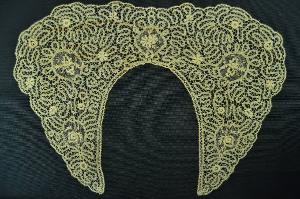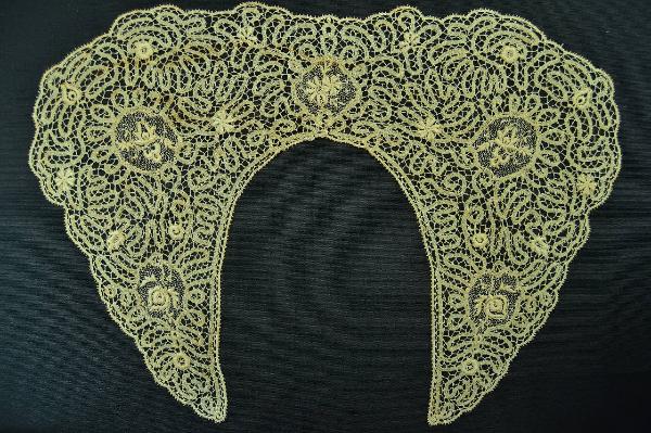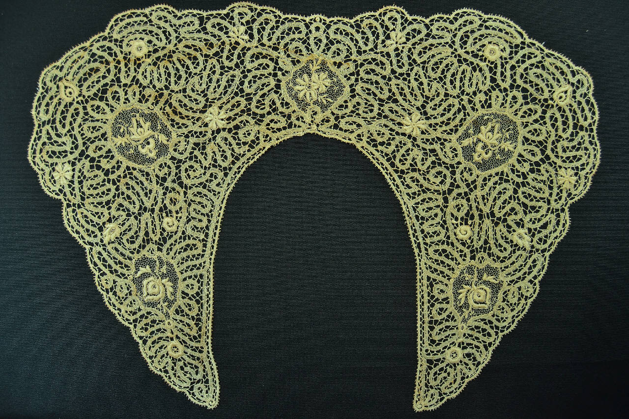 Ampio collo a bavero avorio, in merletto meccanico (chimico?) ad imitazione di merletto tipo Milano, con inserti cuciti in merletto ad imitazione punto Venezia a rilievo. Nastrino ad andamento labirintico che racchiude inserti trasparenti con fiori, boccioli e fiori di loto.