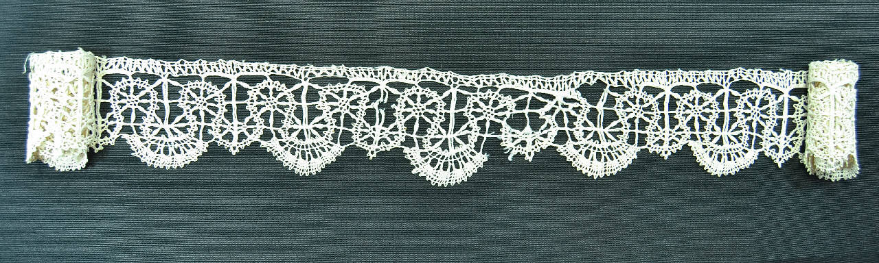 Bordo a fuselli, in lino bianco fili continui del tipo torchon, a p. tela con treccioline e armellette. Un sottile nastrino ad andamento fortemente sinuoso include nelle anse fiori stilizzati a otto petali. Un margine diritto con piede, l'altro ad ampi smerli con motivi a ventaglio generati dall'ansa del nastro.