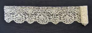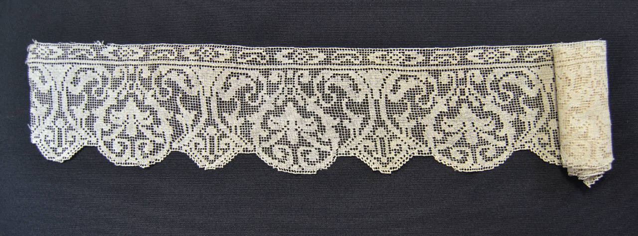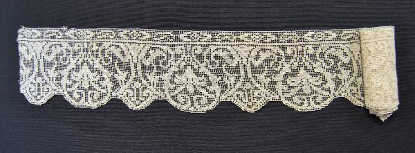 Bordo in linonaturale, in rete filet ricamata a p. tela. Lungo il lato diritto stretta cornice lineare a piccoli motivi geometrici. Al di sotto si alternano due motivi con asse perpendicolare al bordo diritto: due sottili foglie formano una maglia cuoriforme che include giglio stilizzato; due foglie a semipalmetta sostengono un boccio romboidale centrale. L'alternanza dell'elemento cuoriforme e di quello romboidale definisce smerli stondati e triangolari. Il bordo smerlato e rifinito ad ago a p. festone. Uno dei bordi verticali è l'inizio della reta, l'altro è tagliato.
