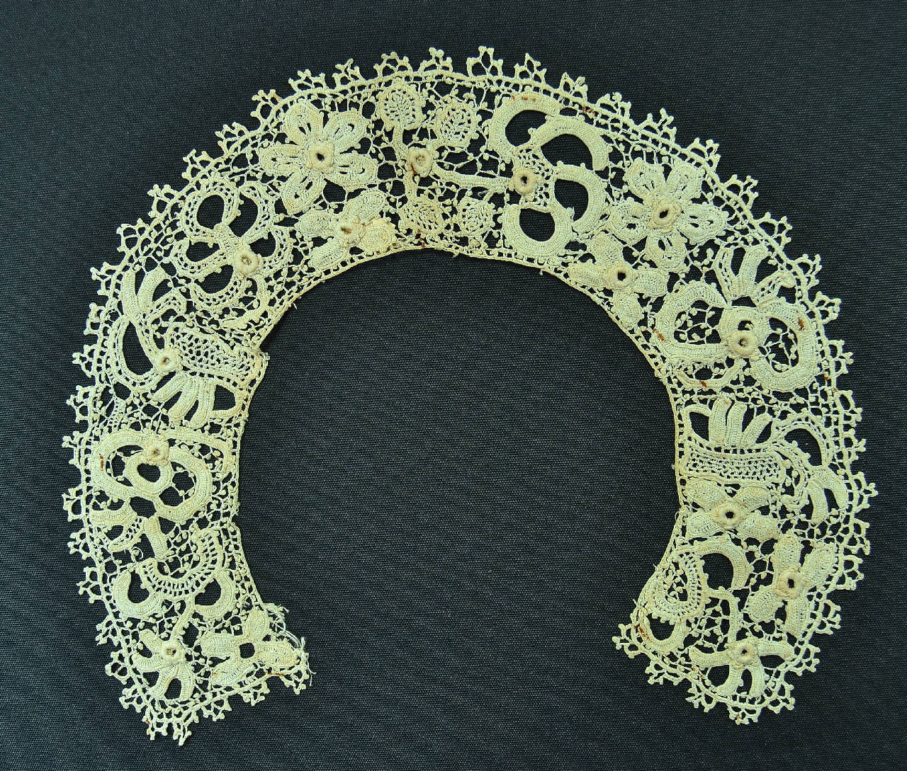 Collo bianco lavorato all'uncinetto tipo trina d'Irlanda: foglie e fiorellini lavorati separatamente (m. bassa e alta) poi collegati da barrette a p. catenella con pippiolini. Bordi esterni ad archetti trilobati, bordo interno con finto piede a rete. Anellini ad ago applicati al centro dei fiorellini, ma erroneamente sul rovescio.