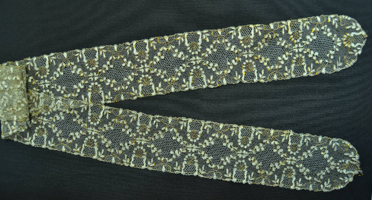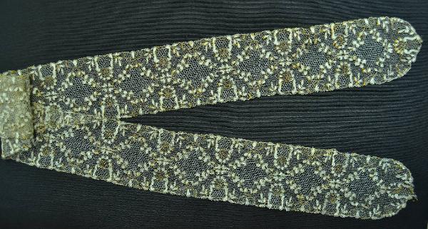 Barba per acconciatura o cravatta femminile in merletto di seta bianca a due spessori e oro filato su anima di seta gialla. Lavorato a fuselli a fili continui con fondo a rete tipo Lille, motivi a p. tela resi dal filo di seta più spesso, profilati dal filo dorato e riempitivi a fond chant. Margini esterni profilati da picot dati dal filo di seta più spesso. \nDecoro tracciato da due sottili tralci speculari con foglioline e fiori, che formano serie centrale di maglie romboidali. Lateralmente alle anse dei tralci si dispongono, poggiati sul bordo esterno, piccoli vasi biansati con ciuffo di bocci tondeggianti.