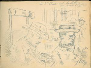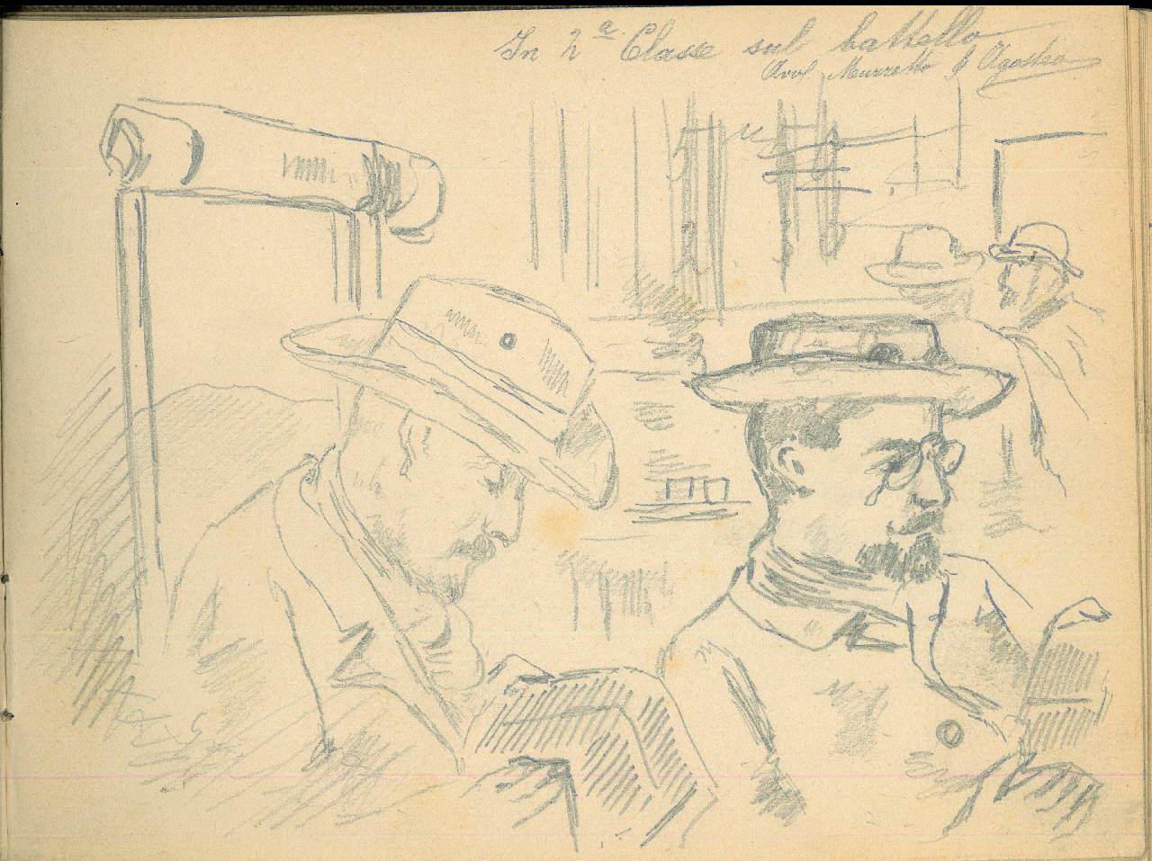 - NOTIZIE STORICO CRITICHE Serie di disegni conservati all'interno di un taccuino da viaggio datato 1892 e posseduto dall'artista Camillo Ghisi. \nLa scena presenta due uomini intenti nella lettura di una rivista all'interno di una sala del battello. Sullo sfondo altri due soggetti, abbozzati, dialogano.