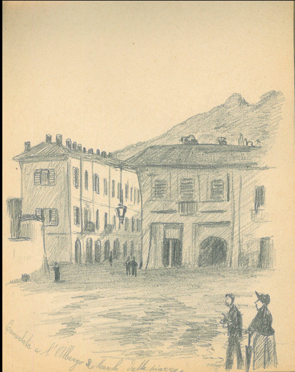 - NOTIZIE STORICO CRITICHE Serie di disegni conservati all'interno di un taccuino da viaggio datato 1892 e posseduto dall'artista Camillo Ghisi.\nScorcio della piazza di Camerlata con l'albergo i Due Merli ed alcune figure umane.