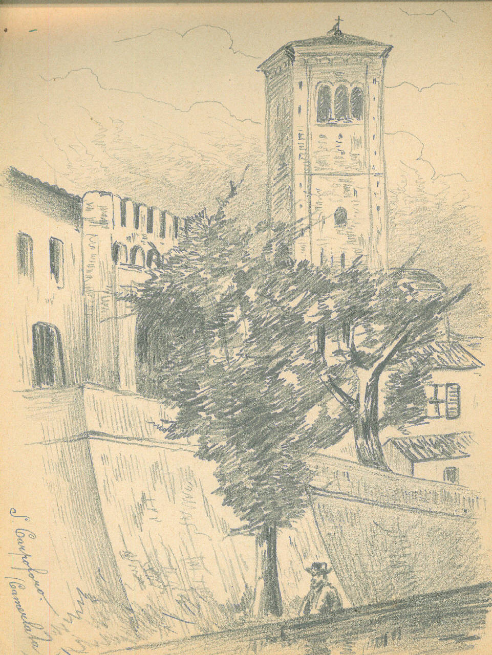 - NOTIZIE STORICO CRITICHE Serie di disegni conservati all'interno di un taccuino da viaggio datato 1892 e posseduto dall'artista Camillo Ghisi.\nScorcio di Camerlata con le mura medievali, la porta d'ingresso alla città ed il campanile romanico.