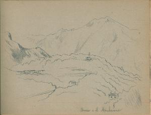 - NOTIZIE STORICO CRITICHE Serie di disegni conservati all'interno di un taccuino da viaggio datato 1892 e posseduto dall'artista Camillo Ghisi.\nPaesaggio montano con alcuni edifici.