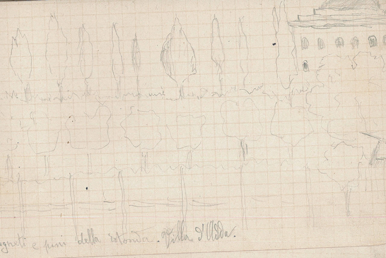 - NOTIZIE STORICO CRITICHE Serie di disegni conservati all'interno di un taccuino da viaggio posseduto dall'artista Camillo Ghisi.\nSchizzo a matita dei vigneti e pini della villa "Rotonda" nel comune di Villa D'Adda.