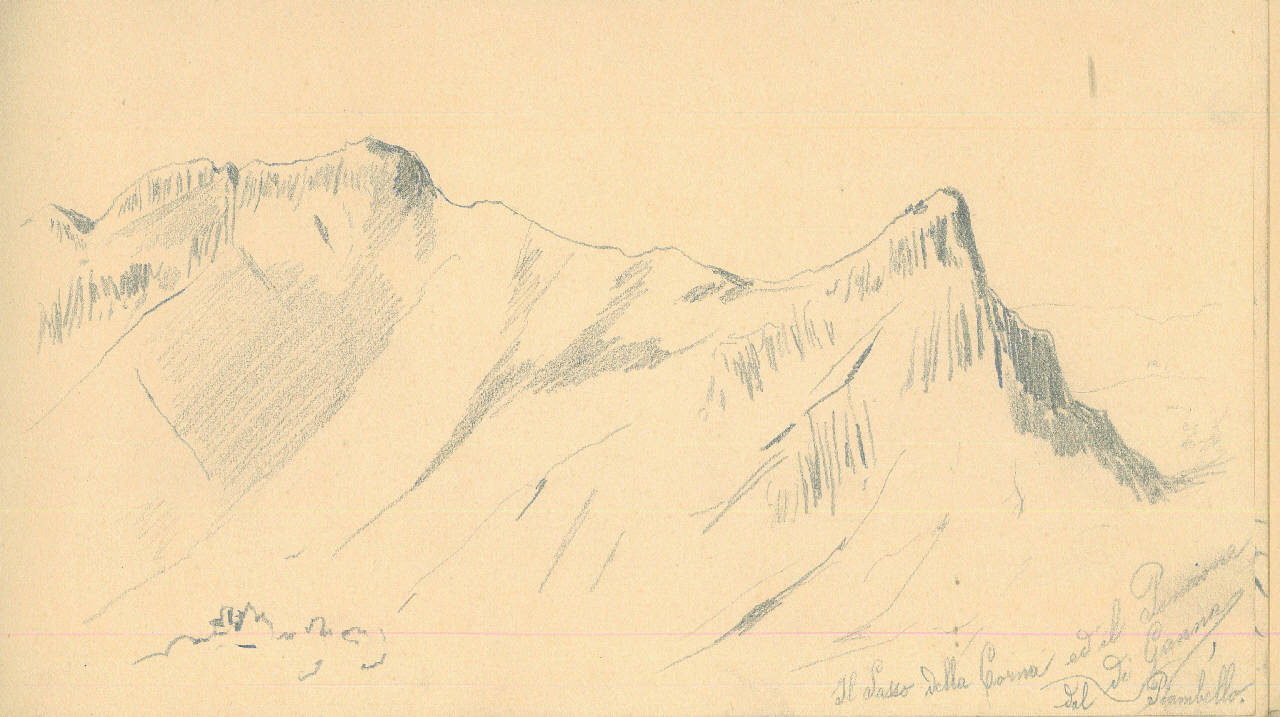 - NOTIZIE STORICO CRITICHE Serie di disegni conservati all'interno di un taccuino posseduto dall'artista Camillo Ghisi. \nIl soggetto raffigura il Sasso della Corna e il Pancione dal di Ganna, Piambello.\nIl taccuino viene indicato nel registro di carico al n° 34305