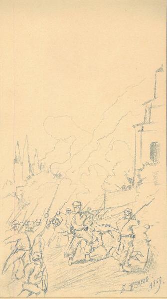 - NOTIZIE STORICO CRITICHE Serie di disegni conservati all'interno di un taccuino posseduto dall'artista Camillo Ghisi. \nIl soggetto raffigura la celebre battaglia di San Fermo del 1859. La battaglia di San Fermo ebbe luogo il 27 maggio 1859, quando Garibaldi, al comando dei Cacciatori, sgomberò le posizioni avanzate austriache poste a difesa di Como, si fortificò e seppe respingere un contrattacco, inducendo il nemico a sgomberare la città.\nIl taccuino viene indicato nel registro di carico al n° 34305