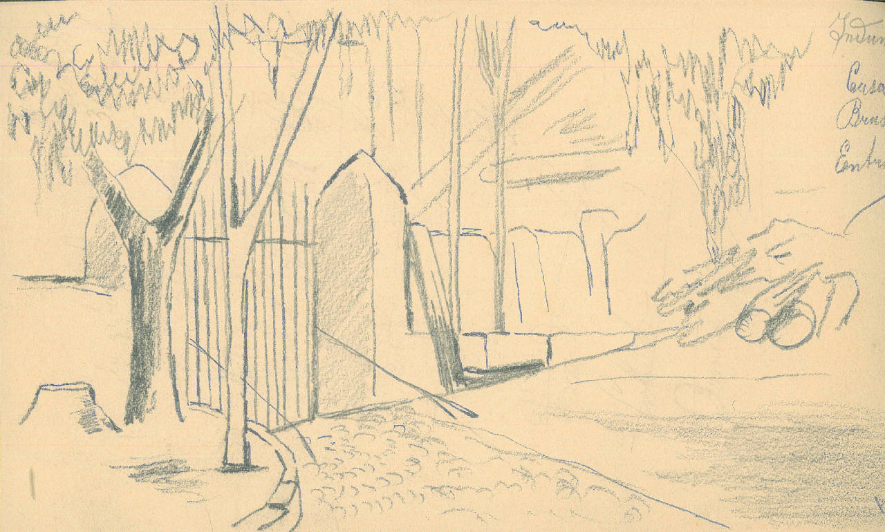 - NOTIZIE STORICO CRITICHE Serie di disegni conservati all'interno di un taccuino posseduto dall'artista Camillo Ghisi. \nIl soggetto raffigura l'ingresso di casa Brusa (Induno)\nIl taccuino viene indicato nel registro di carico al n° 34305