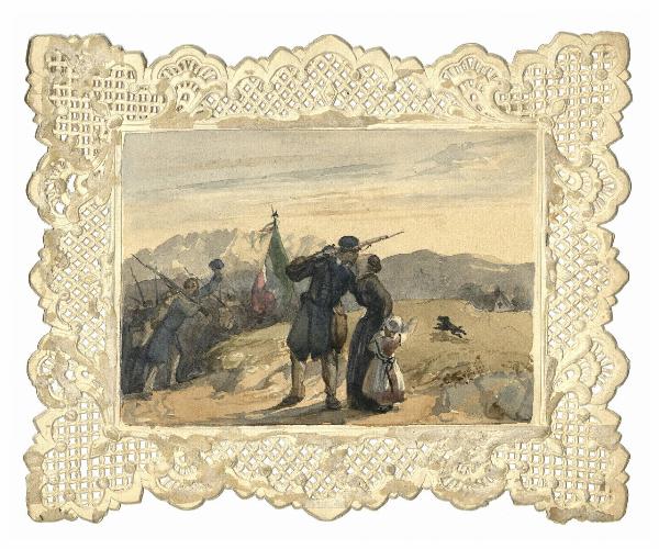 Scena di saluto del volontario. Paesaggio montuoso, sulla sinistra si intravedono le trupppe.