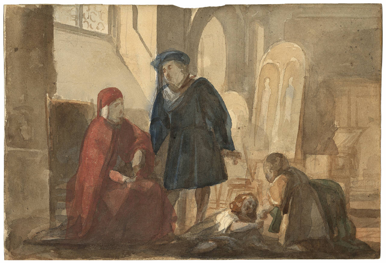 Disegno ad acquarello su carta con rappresentazione di soggetti con costumi del '300 all'interno di una struttura architettonica.