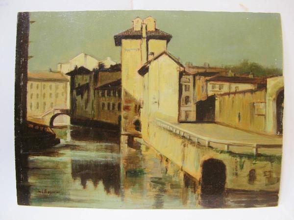 Dipinto con veduta di Milano, raffigurante Via Vallone nei pressi del Naviglio