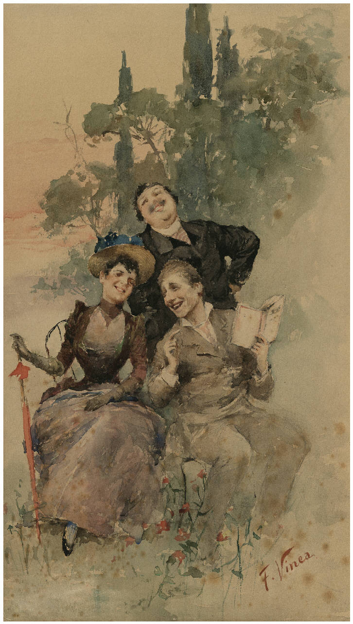 - NOTIZIE STORICO CRITICHE l'acquarello raffigura Yorick (Pietro Coccoluto Ferrigni) giornalista livornese, autore di numerose recensioni teatrali, Edoardo Ferravilla, attore in dialetto milanese attivo nella seconda metà dell'Ottocento in alcune compagnie teatrali e Emma Ivon, prima attrice della Compagnia Milanese folgorata dalla figura di Edoardo Ferravilla a cui resterà legata sino alla fine dei suoi giorni. \nI tre personaggi e il pittore Francesco Vinea frequentarono il Caffè Michelangelo, ritrovo di artisti e letterati. Il locale chiuso nel 1920 ospita oggi il Museo Leonardo da Vinci Firenze.