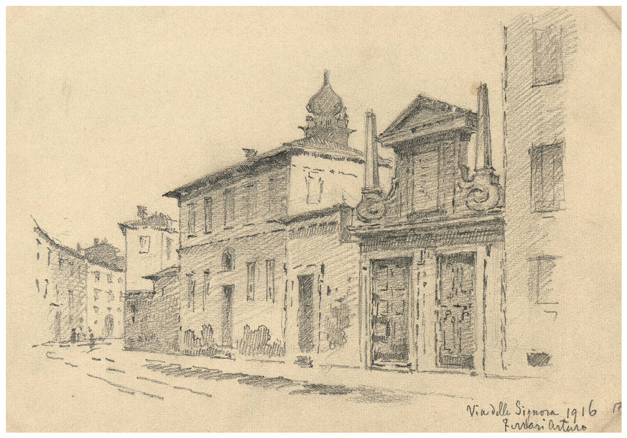 Disegno a matita raffigurante via della Signora a Milano \nIl disegno si trova all'interno di un album contenente una raccolta di disegni di Arturo Ferrari.