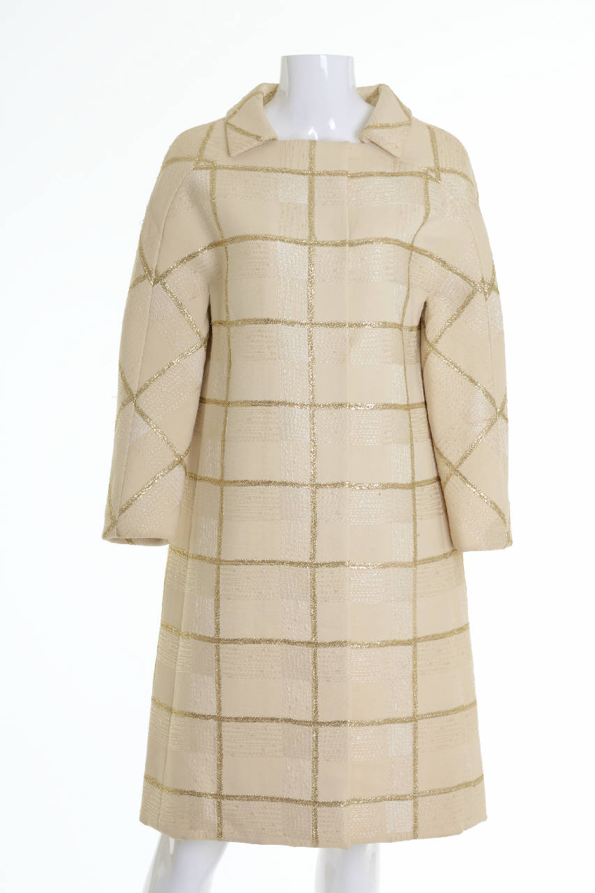 Cappotto diritto doppiopetto con colletto scostato e maniche a tre quarti a kimono. Il capo è frutto di uno studiato progetto modellistico che utilizza forme geometriche piane. Il dietro è formato da un unico telo rettangolare con comprende i fianchi, tutta la parte superiore delle maniche a kimono e le spalle, modellate con una pince al collo. I davanti sono due teli rettangolari tagliati insieme alla parte inferiore delle maniche. Tasselli sottomanica.\nIl piccolo colletto scostato, confezionato con tessuto in sbieco, lascia libera la parte sormontata del doppiopetto. La forma del cappotto è sottolineata dal perfetto montaggio del disegno a quadri del ricamo. L'allacciatura è costituita da automatici nascosti.