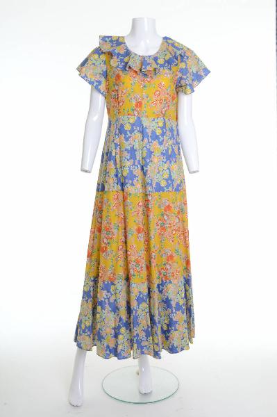 L'abito longuette tagliato in vita è confezionato con bande parallele di tessuto dai colori alternati.\nIl corpetto di tela a fondo giallo, in quattro teli sagomato con pinces, ha lo scollo arrotondato bordato con una balza pieghettata ricadente e le manich ecorte ad aletta. Sotto le ascelle due tasselli triangolari. Volant, tasselli e maniche sono di tela fondo azzurro. La gonna a campana è a tre bande di colori alternati. Sul davanti, due piccole pieghe parzialmente cucite ne aumentano l'ampiezza. Allacciatura con cerniera sul fianco sinistro.