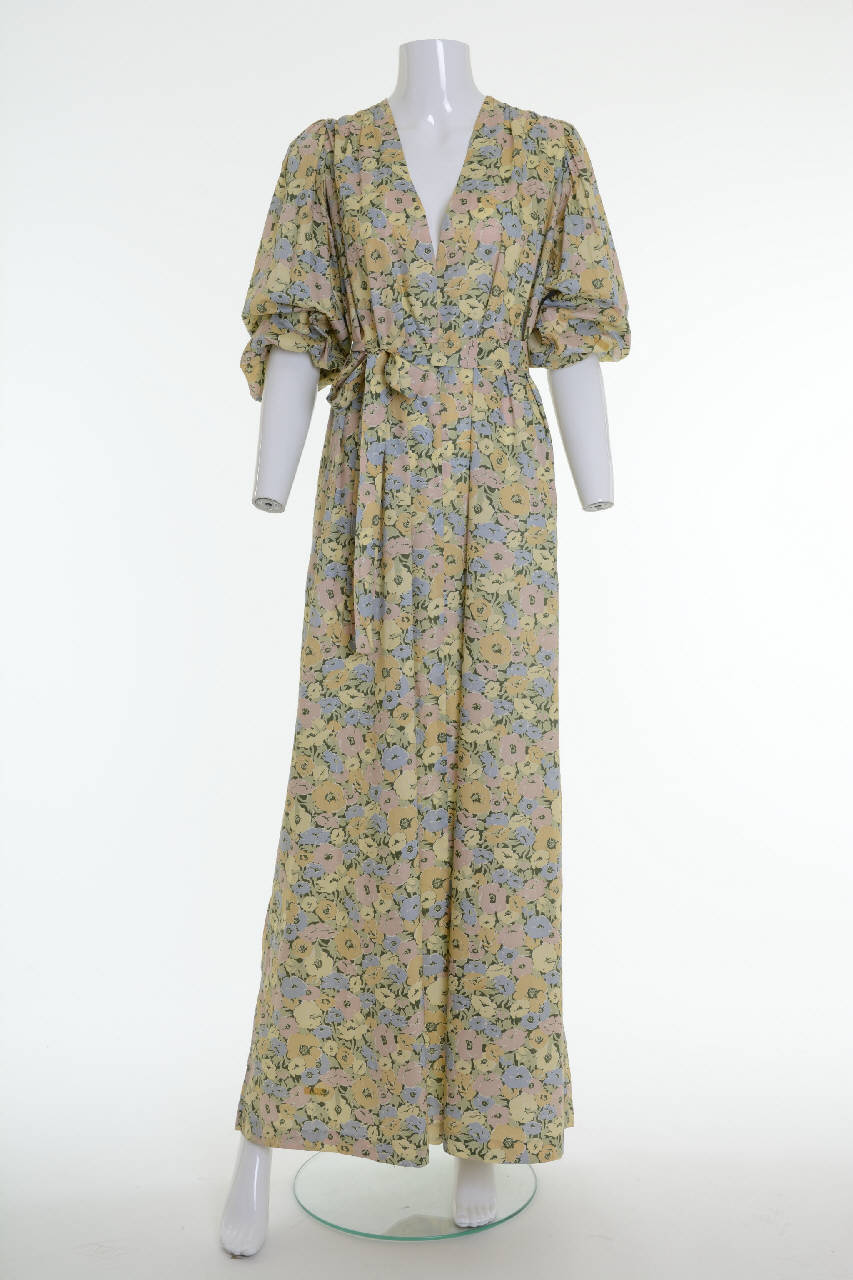 L'abito lungo ha lo scollo a punta, il carré sulle spalle e le maniche lunche strette al polso con un elastico. È confezionato in quattro teli leggermente a trapezio arricciati al carré. Tasche inserite ai fianchi. In vita, una lunga cintura a nastro dello stesso tessuto.