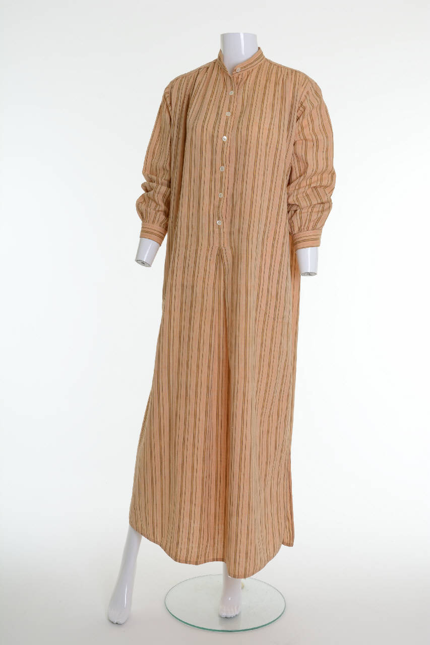 Il caftano presenta una aprziale abbottonatura e uno sfondo piega sul davanti. Il colletto è alla coreana e le maniche sono lunghe con polsino. Sul dietro, un carré ferma una lieve arricciatura che dà ampiezza alla parte posteriore.