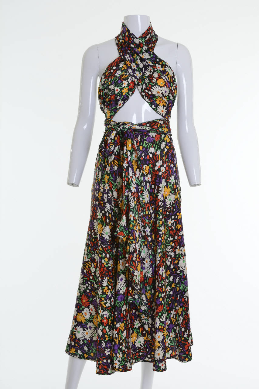 Il completo in due pezzi è composto di gonna e stola/corpetto. La stola di forma rettangolare con i lati corti tagliati obliqui, è confezionata in sbieco in due teli bordati a zigzag. È lunga 350 cm e alta 32 cm. Il corpetto viene formato passandola intorno al collo, incrociandola sul davanti, girandola intorno alla vita fino ad annodarne le estremità sul davanti.\nLa gonna longuette a semi-ruota in sbieco, ha la cintura in vita e tasche inserite sui fianchi. È allacciata con cerniera e ganci sul fianco sinistro.