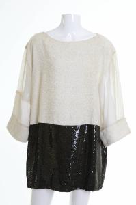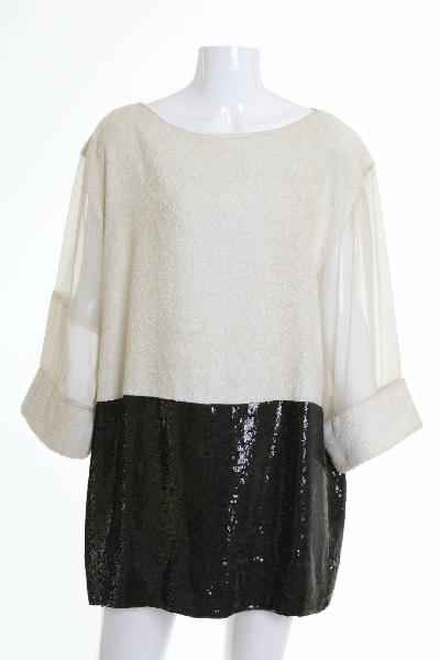 Il modello, di foggia diritto con scollo a barca bordato di raso e maniche a tre quarti, è caratterizzato dalla lavorazione a teli geometrici di materiali diversi e contrastanti. Il davanti è formato da un quadrato di spugna nella parte superiore e da un rettangolo di paillettes nere in quella inferiore. Sul dietro fra la parte di spugna e quella di paillettes è inserito un pannello quadrangolare di organza. Le maniche diritte con spalle ribassate sono trattate in modo differente l'una dall'altra: la sinistra è di organza con il polso di spugna; la destra è di organza, raso e spugna. La parte di organza e quella di raso sono unite da una lavorazione a merletto.
