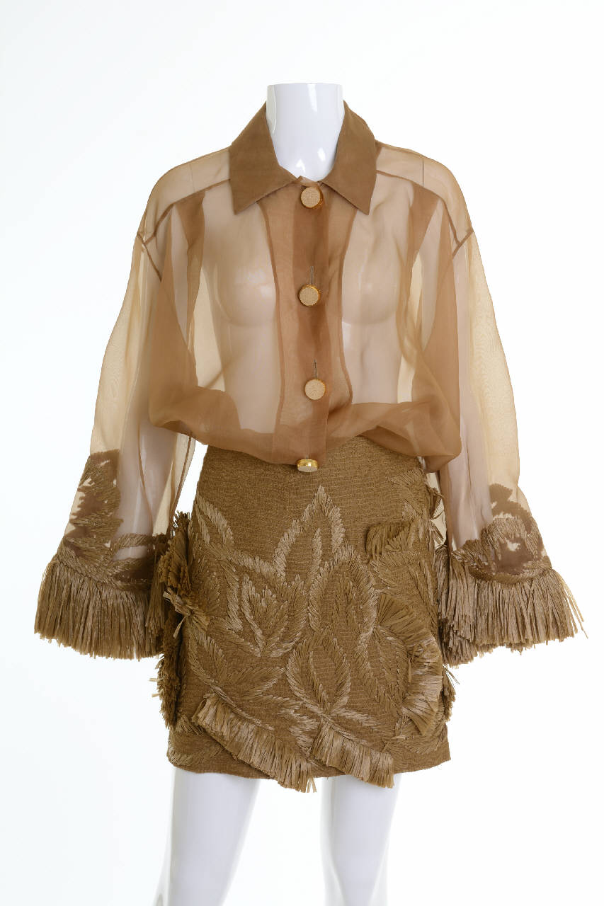 La camicia lunga di organza di taglio maschile è resa molto ampia grazie a due pieghe sul davanti e lo sfondo piega sul dietro. Il colletto a punte ha il solino posteriore. Le spalle presentano il carré e le maniche a giro, lunghe e diritte, sono sagomate all'orlo. Ai polsi sono decorate con un ricamo a motivi vegetali stilizzati in rafia posata e a frange eseguito sul rinforzo di tulle collocato nel rovescio della manica. Allacciatura anteriore con quattor bottoni di metallo.\nLa gonna corta, diritta e a vita bassa, confezionata in un telo di crêpe doppiato con garza e rinforzato con impunture parallele in tinta, è modellata con pinces sui fianchi. L'intera parte bassa della gonna è ricamata con rafia a motivo di foglie e frange. La fodera è di taffetas e l'allacciatura è costituita da una cerniera e un bottone al centro dietro.
