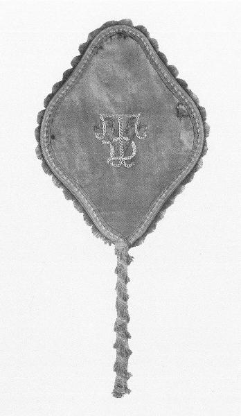 Ventola da fuoco. Schermo a forma di losanga arrotondata con intelaiatura metallica al recto in tela grezza con decoro ricamato a più colori a punto lanciato e a punto smerlo su tessuto stampato, ritagliato e applicato sulla tela di fondo. Al verso in raso di seta verde scuro ricamato in giallo, bianco e marrone a punto a nodi francesi e a punto zig-zag; bordo in passamaneria con frangia in lana che scende a ricoprire il manico.\nIl motivo decorativo è costituito da un fiore di melograno posto al centro da cui si dipartono a cornice larghe foglie, con un fiore alla sommità della composizione. Al verso sono ricamate, al centro dello schermo, le lettere iniziali "TVD" intrecciate.\nSotto il ricamo traspare disegno stampato che rivela la derivazione del motivo decorativo da un cartamodello, forse da rivista.