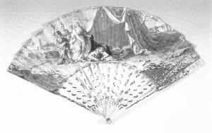 - NOTIZIE STORICO CRITICHE Poiché le stecche sono intere lungo la pagina, all'uso olandese, ma plausibilmente sono state lavorate in Francia e il soggetto è più nordico che italiano, nonostante i paesaggi ai lati della tenda e l'accostamento del blu con il rosso riconducano ai modi della pittura italiana, parrebbe di poter affermare che questo ventaglio sia stato prodotto per il mercato olandese con il contributo di manifatture diverse, quella francese e quella italiana. Anche il paesaggio al verso è di gusto olandese.