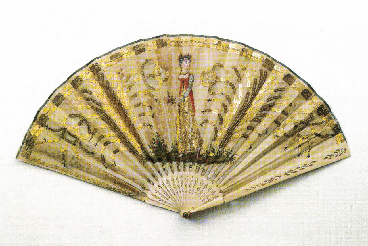 Ventaglio pieghevole da sera. Diciotto stecche d'avorio a spatola tronca traforate a sottili tralci di foglioline stilizzate, estremità dipinte in celeste. Rivetto e occhiello in ottone.\nPagina in taffetas di seta color avorio, ricamata a paillettes dorate con rete "plumetis" bianca. Al centro è dipinta ad olio una figura, con applicazioni di paillettes dorate sull'abito; volto in avorio dipinto; ricami in filo nero. Ai lati della figura si alzano due grandi cespi di paillettes dorate da cui escono due fiori trilobati, in rete, con pistilli ricamati in fili bianchi di cotone. Pagina profilata in alto da doppio giro di paillettes dorate, sugli altri lati uno solo. Bordino di finizione in carta dorata.\nTracce evidenti di restauri precedenti.