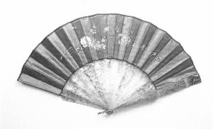 Ventaglio pieghevole. Quattordici stecche di tartaruga bionda traforate; guardie a spatola decorate come le stecche minori da motivi a traforo di racemi alternati a fiori e cornucopie. Rivetto in metallo, occhiello in acciaio, anello reggiventaglio con anellino per "chateleine" in ottone.\nPagina doppia in raso di seta marrone dipinta ad olio, decorata da un tralcio di rose gialle, fiori di melo, di pesco e nontiscordardime disposto ad arco sulle stecche minori. Bordino di finizione all'estremità della pagina in pizzo nero meccanico.