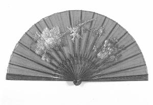 Ventaglio pieghevole da lutto. Diciotto stecche di legno dipinto in nero, intagliate e traforate. Le guardie sono decorate da un fitto e regolare motivo a passamaneria, le minori da fregi intagliati e, nella parte superiore, da un traforo a lira. Rivetto in metallo, occhiello e anello reggiventaglio in ottone laccato nero.\nPagina in organza di seta nera su cui è dipinto a tempera un tralcio di crisantemi e un mazzo di viole. Bordino di finizione in pizzo nero meccanico.