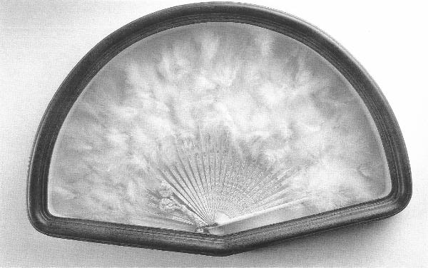 Ventaglio pieghevole per signorine. Ventotto stecche di legno tinte di bianco con impressi fregi argentati; guardie leggermente bombate e lisce, le minori decorate da sottili tralci floreali. Rivetto in metallo, occhiello e anello reggiventaglio in ottone; cordoncino ritorto in seta color crema con nappe dello stesso materiale all'estremità.\nPagina in piume di cigno bianche e tinte di rosa alternate liberamente.