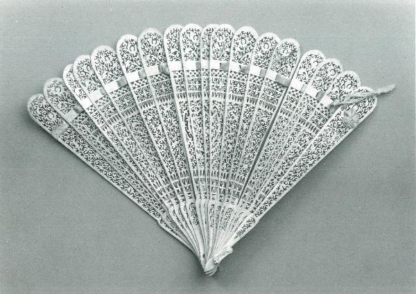 Ventaglio brisé. Diciotto stecche in osso a spatola stondata e minutamente segmentata, interamente traforate a finissimi arabeschi, attraversate da motivi cuneiformi ripetuti in due fasce che delimitano il campo della pagina. Spiegate, le stecche compongono al centro una cartella dalla cornice a forma di scudo. Nastro in raso di seta celeste, a piccole coccarde sulle guardie; un nastrino intrecciato di seta bianca funge da perno.