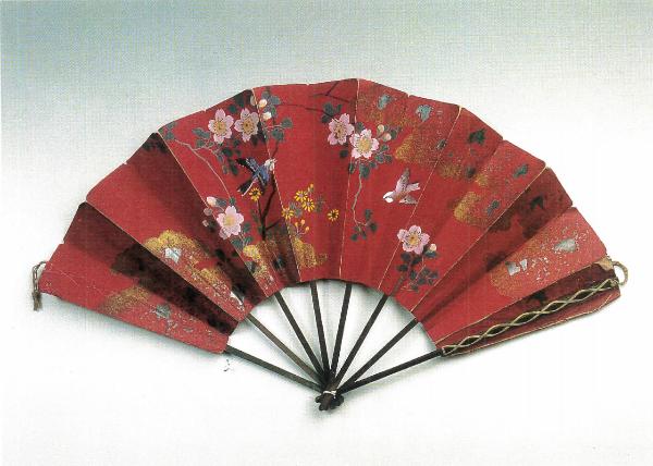 Ventaglio pieghevole. Otto stecche sottili di bambou dipinto in marrone; mancando il perno, le stecche sono state unite da un cordoncino di cotone bianco. Cordoncino écru incrociato sulle guardie.\nPagina in cartoncino rosso dipinto a tempera con decoro a tralci di fiori di pesco e margherite gialle e due uccellini in volo tra nuvole argentate e dorate. Al verso un tralcio di dalie nei toni del rosa e del grigio, disposto asimmetricamente.\nIn basso a destra timbro ad inchiostro nero: "R.C. 124".