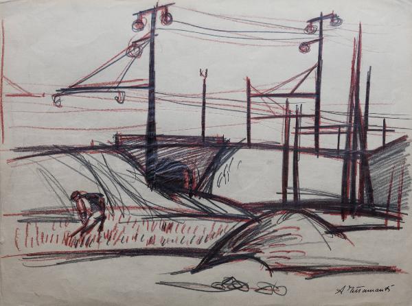 Periferia urbana con ferrovia. Bozzetto