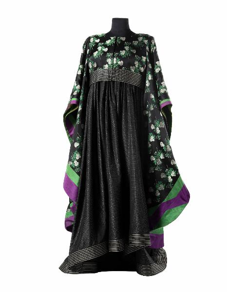 Abito da gala costituito da un abito in seta jacquard con corpetto in moiré e gonna nera e micro-pois color argento. Sopravveste kimono in seta jacquard a fiori con bordi in moiré viola e verde smeraldo, recante sul retro un grande fiocco rigido. All'abito è stato abbinato un piccolo ventaglio rigido con gli inserti in madreperla di ispirazione orientale (inv V 224) e una stola in chiffon viola. Tessuti Taroni.