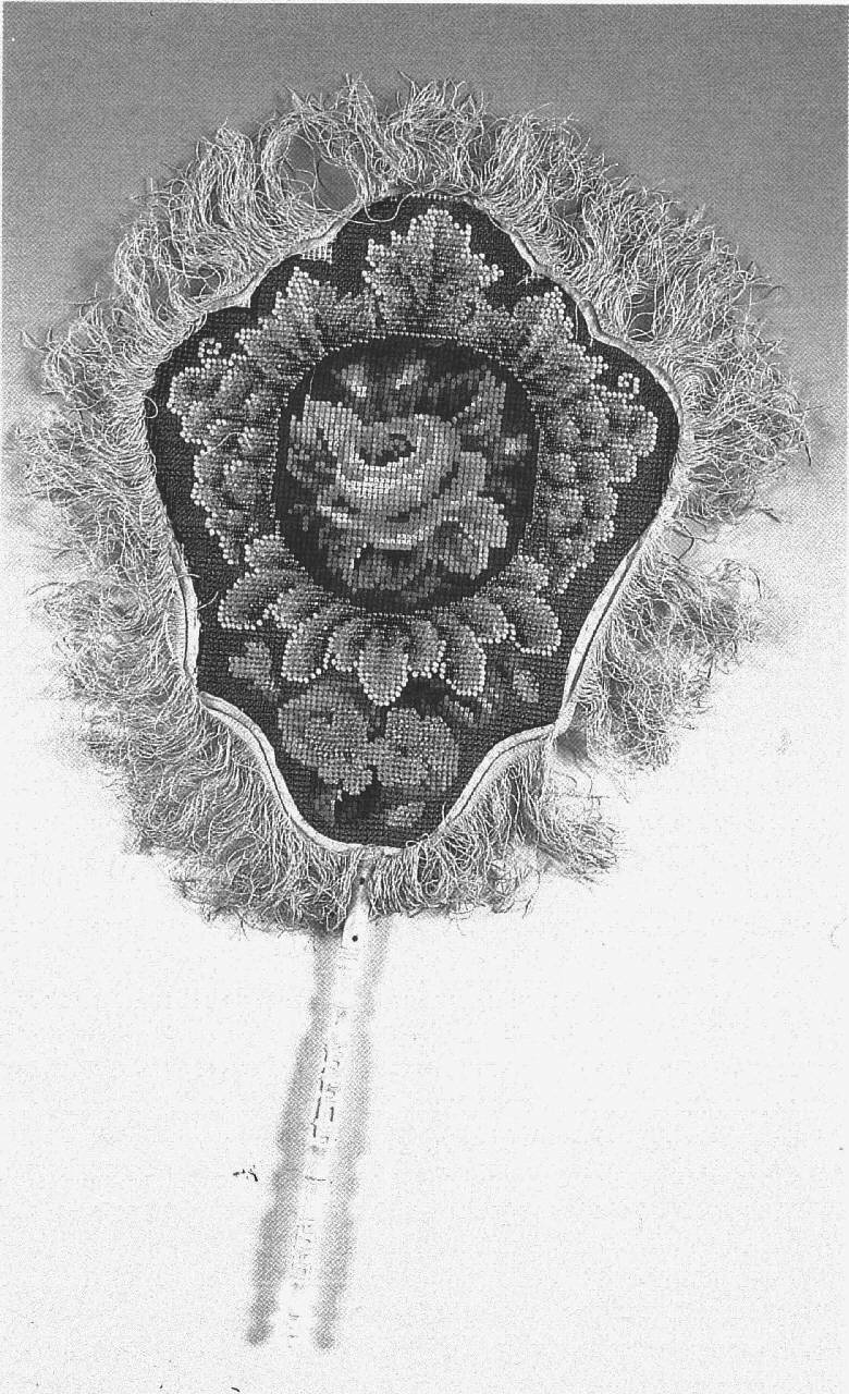 Ventola da fuoco. Manico in osso bianco intagliato e tornito a motivi serpentinati e anelliformi. Schermo esalobato in tela ricamata con fili policromi di lana e seta a punto croce: al centro è ricamato in verde scuro un medaglione tondeggiante con, all'interno, una grande rosa rossa; intorno, su sfondo azzurro, foglie di vite, grappoli d'uva, larghe foglie e, in basso, due violaciocche con boccioli.\nL'intelaiatura dello schermo è rivestita in seta color avorio come la frangia che contorna la ventola; perline di vetro bianche, trasparenti, marroni, beige, nere, ambrate, gialline e acciaiate.