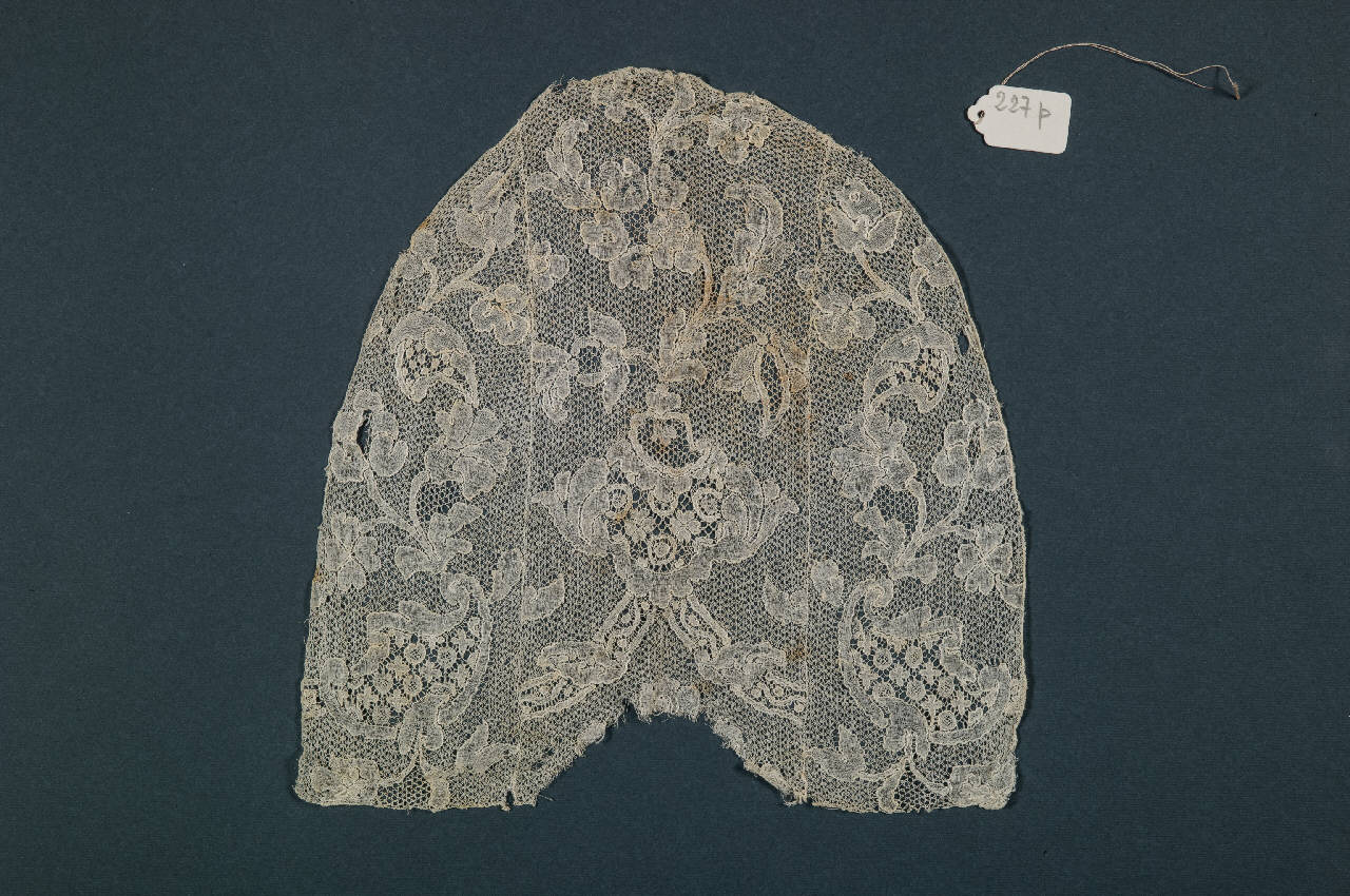 Fondo di cuffia a fuselli tipo Antwerps (pizzo di Anversa) in lino ingiallito; è formata da tre frammenhti cuciti insieme senza rispettare il modulo del decoro. Al centro un vaso che sostiene un elemento a cuore. Frutti di melograno, baccelli e fiori ai lati.
