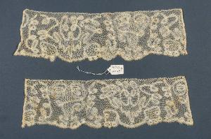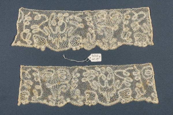 Due frammenti uguali, anche nella misura (cm 9,5 x 29), di bordo a fuselli a parti riportate in lino color crema. La rete è esagonale , va in più direzioni, il nastrino del pizzo Milano disegna intrecci a occhiolini. Riempitivi a "point d'esprit" quadrato.