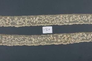 Bordo a fuselli a parti riportate tipo Bruxelles su rete "drochel". All'interno degli elementi decorativi "remplis" diversi. cm 5,5 x 150.