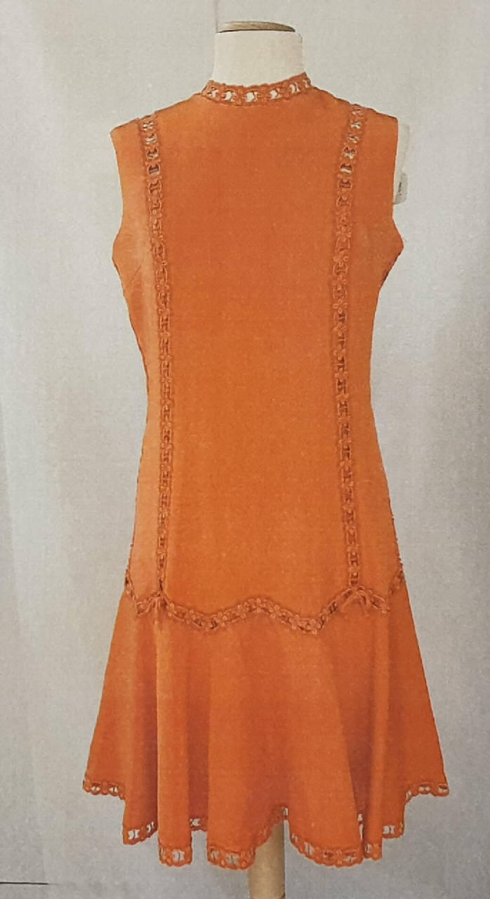 Abito da cocktail arancione con inserti in pizzo meccanico; \ndoppia fodera in organza di seta in colore e raso; chiusura posteriore con cerniera lampo.