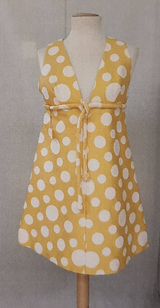 Abito estivo linea a trapezio in cotone giallo a pois bianchi chiuso nella parte posteriore con una cerniera nascosta; cintura realizzata nello stesso tessuto a forma di cordone imbottito e concluso da nodi.\nfodera in taffetas bianca.