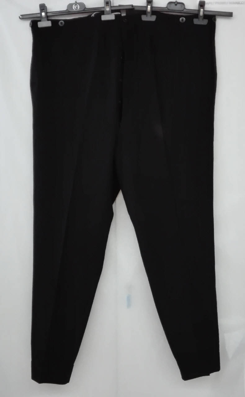 Pantaloni maschili di panno di lana nero, chiusura anteriore con sette bottoni in pasta. \nin vita, cinturino nella parte posteriore con fibbia probabilmente sostituita in parte; \nbanda laterale di passamaneria nera lungo il calzone
