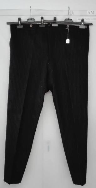 Pantaloni di panno di lana nera gessato, chiusura a sei bottoni e un gancio metallico.\nin vita sei bottoni in pasta; su alcuni bottoni scritta "for gentlemen".\ngancio metallico in vita scritta "solido ed elegante"