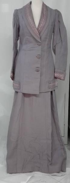 Completo femminile in lana lilla composto da giacca con revers sciallati, chiusura anteriore a tre bottoni; allo scollo, ai polsi e al fondo della giacca applicazioni in passamaneria.\nleggera arricciatura delle maniche al giro spalla. \ngonna in lana in colore leggermente svasata, chiusura posteriore con ganci automatici.\netichetta "Elsa Pacciarelli confezioni per signora / ROMA"