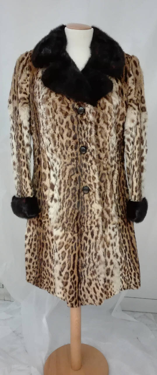 Pelliccia di leopardo con collo e polsini in visone, chiusura a tre bottoni rivestiti in pelle, due tasche laterali.\netichetta sulla fodera interna lungo il fianco "Terruzzi / Corso Venezia, 2 - Milano"